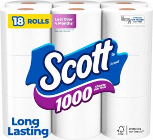 • 18 rolls of Scott 1000 Toilet Paper, 1-ply, 1000 sheets per roll